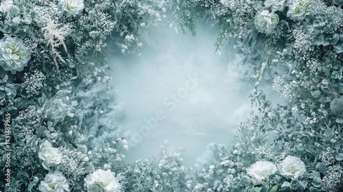 An exquisitely delicate garden themed wedding backdrop showcasing dreamy white flowers and lush green foliage creating a romantic and ethereal atmosphere for vows.