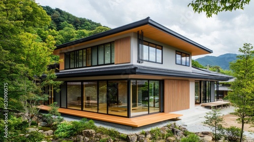 An exterior view of a modern Japanese home with a minimalist design, clean lines, and large windows, blending seamlessly with the surrounding natural landscape.
