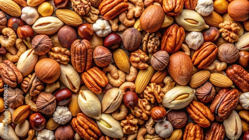 An extreme close-up top view of a variety of shelled nuts , nuts, top view, variety, shelled, background, close-up, food