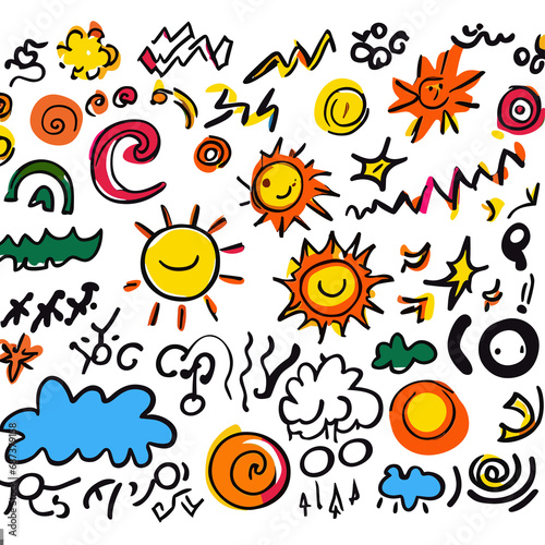 An exuberant illustration featuring a variety of suns drawn by children, each radiating its unique personality and warmth in a colorful parade.