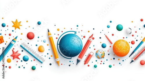 An eye-catching back-to-school icon set with bright illustrations of crayons, rulers, and globes, perfect for educational themes and materials.