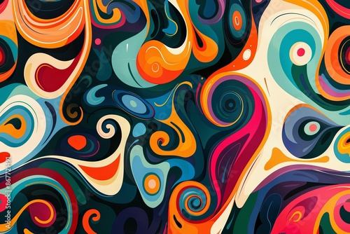 An eye-catching flat background composed of swirling psychedelic shapes, showcasing a harmonious blend of vivid hues and intricate patterns. The design exudes a sense of energy and movement, ideal