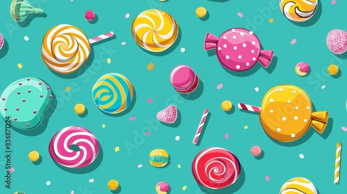 An eye-catching image showing a variety of colorful candies scattered on a vibrant teal backdrop, illustrating confectionery sweetness