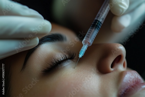 An featuring a cosmetologist performing a beauty injection in the delicate eye area, highlighting aesthetic treatments for rejuvenation and skincare