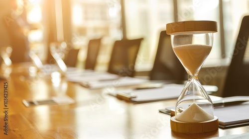 An hourglass sits on a wooden conference table, sunlit by a window. Concept of time management and urgency. For business presentations or productivity guides.
