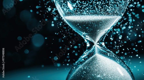 An hourglass where the sand transforms into abstract symbols representing innovation and progress as it falls, symbolizing the role of time and strategy in managing change