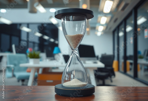 An hourglass with a blurred background of a modern office - Symbolizing pressure and the strain of deadlines