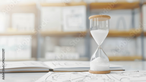 An hourglass with flowing sand on a desk, symbolizing time management and productivity in a serene workspace.