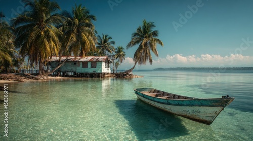 An idyllic coastal scene featuring a tranquil boat, a charming building, and palm trees, all under a clear, blue sky. The scene evokes feelings of peace, tranquility.