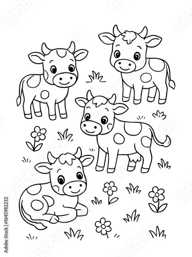 An idyllic rural landscape with many cows grazing in a green field under a clear blue sky. Perfect for teaching children about farm animals through creative colouring.