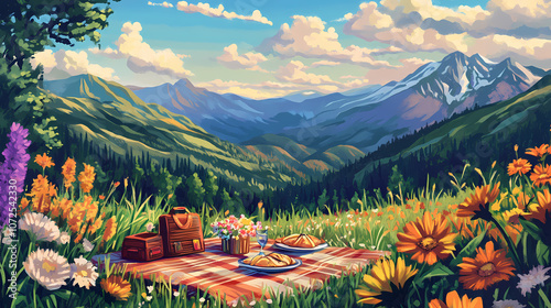 An idyllic scene of a picnic setup in a mountain meadow, with rolling hills and vibrant flowers providing a picturesque backdrop. rolling meadows. illustration. Vibrant. Illustration