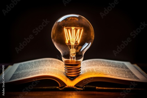 An illuminated light bulb casting a warm glow on the pages of a book, representing creativity