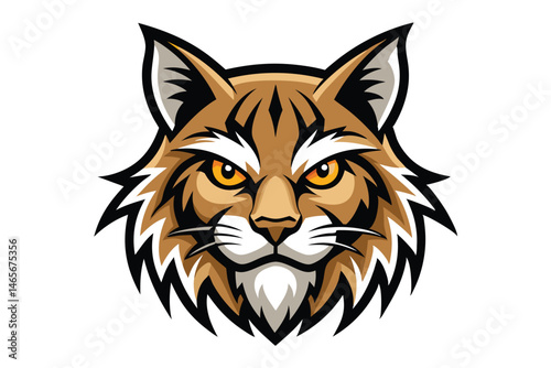 An illustrated bobcat head with golden eyes presents a symmetrical animal design