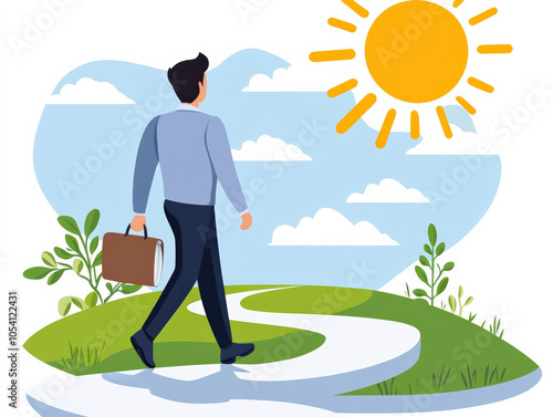 An illustrated businessman walking on a winding path under the sun, symbolizing progress, growth, and career goals.