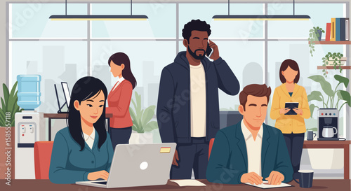 An illustration depicts a diverse group of colleagues working in a modern office setting, engaged in various tasks with a focus on collaboration and communication.