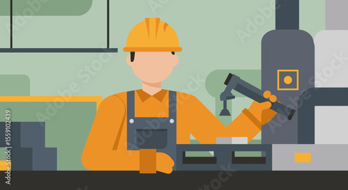 An illustration depicts a factory worker in a hard hat operating machinery, showcasing the industrial environment and the skilled labor involved in manufacturing processes.