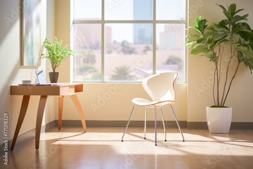 An illustration of a home office with a large window, a desk, a chair, and a plant