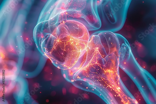 An illustration of a knee joint with a glowing blue and yellow network of nerves and data points. The knee joint is in focus, with a slight blur to the edges of the image.