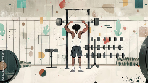 An illustration of a person lifting weights in a gym, simple and clean lines, muted color palette