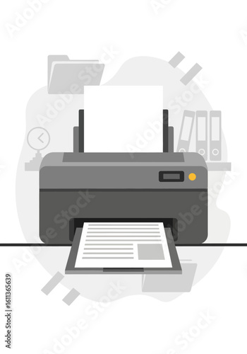An illustration of a printer with paper being printed, set against a stylized office background with folders and a clock.