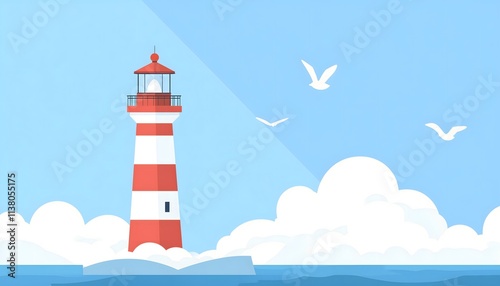 An illustration of a red and white lighthouse under a blue sky