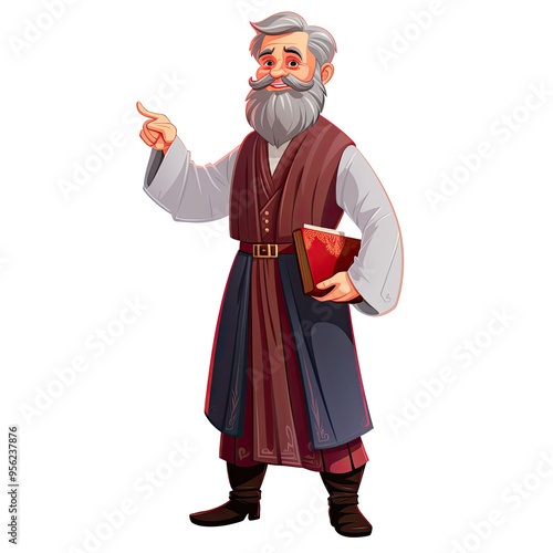 An illustration of a smiling male teacher with a beard, holding a book