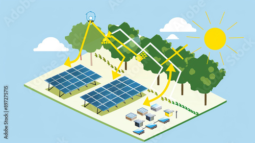An illustration of a solar energy system featuring solar panels on a building, integrating renewable energy technology into the environment. This image highlights sustainable energy solutions.