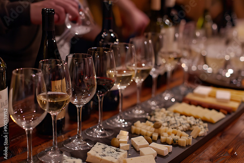 An illustration of a wine tasting event, featuring people sampling different wines in a cozy setting. The scene includes wine glasses, bottles, cheese platters, and a sommelier guiding the tasting, cr