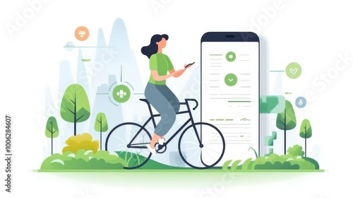 An illustration of a woman cycling while using a smartphone against a nature backdrop, highlighting the blend of technology and active lifestyle.