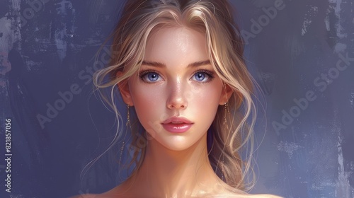 An illustration of a young blonde woman with striking blue eyes and flowing hair against a blurred blue background.