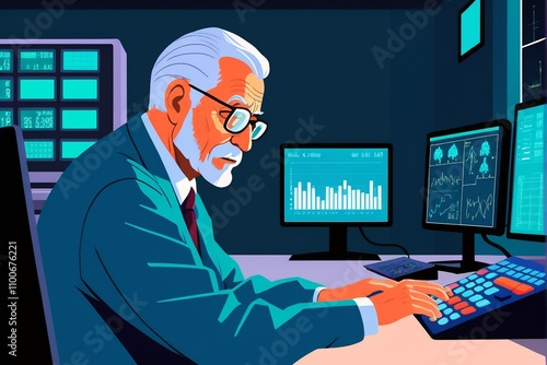 An illustration of an older man in a suit, wearing glasses, working at a desk with multiple computer monitors and a keyboard.