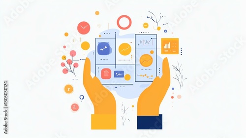 An illustration of hands holding digital data analytics with colorful graphs and icons, representing data visualization, insights, and modern technology integration for businesses.