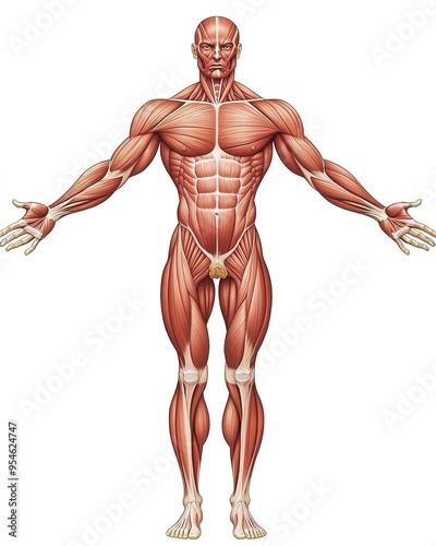 An illustration of the human body with muscles showing, viewed from above in full length against a white background.