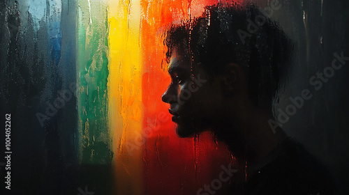 An illustration of woman silhouette against a rainbow-colored wall symbolizing LGBTQ pride, diversity and freedom.