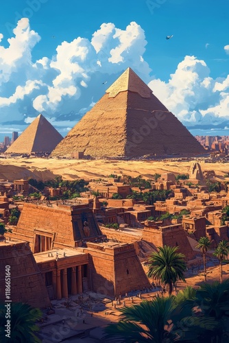 An illustration poster of giza in eygpt including the great pyramids st the center of the image and other typical lanmarks in the background