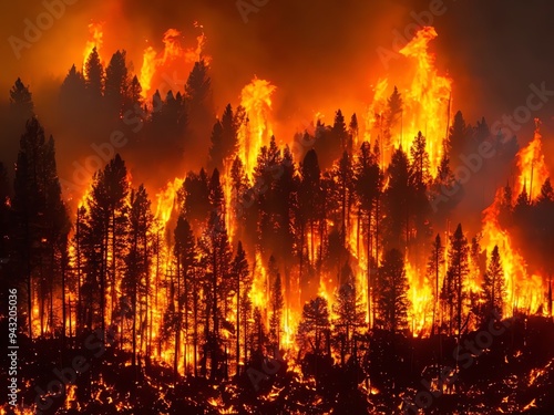 An image of a forest fire engulfing a dense woodland with dramatic thick smoke