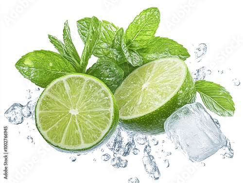 An image of a fresh lime slice with mint leaves and ice cubes,