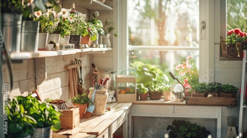 An image of a garden shed interior, neatly organized gardening tools and supplies, in a bright and airy space. The background features shelves with pots, seeds, and gloves, and a window with a view