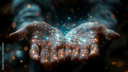 An image of a man holding out his hand with a holographic internet network above it, symbolizing a connected and high-tech world
