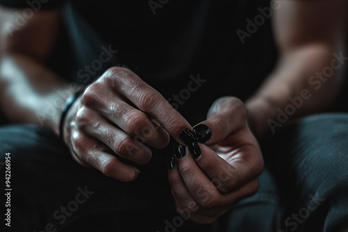 An image of a man sitting with black painted nails. Male manicure. The focus is on the hands, showing detailed textures of the skin and the shiny black polish being carefully applied.