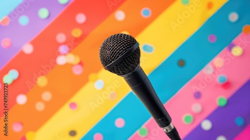 an image of a Pride radio station promotion graphic with microphone and a pride flag in background