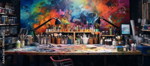 An image of a set of art supplies including colored pencils, paints, brushes and a sketchbook