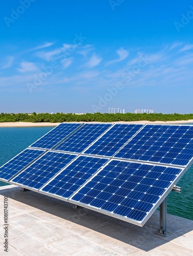 An image of a solar panel under a bright sun against a clear blue sky, symbolizing renewable energy and sustainability.