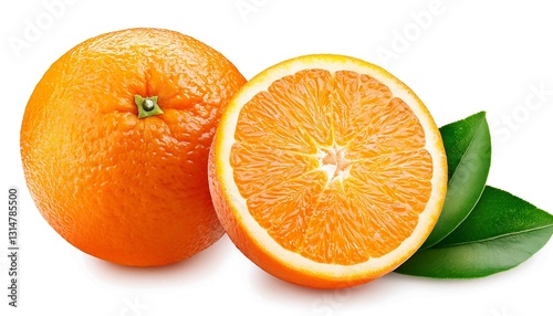 An image of a vibrant orange with green leaves, showcasing its fresh and juicy appeal with a focus on its bright color and natural freshness