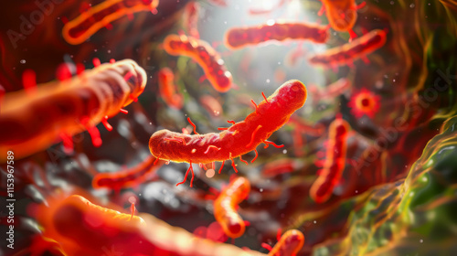 An image of microbiological warfare showing beneficial gut bacteria fighting harmful pathogens.