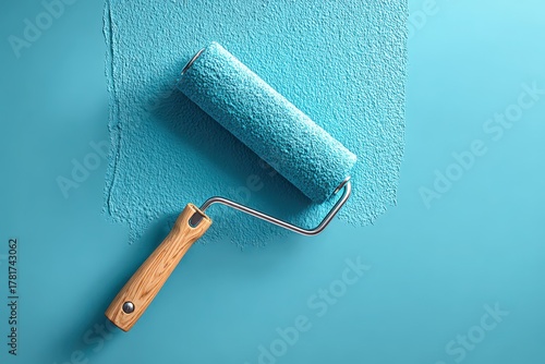 An image shows a paint roller applying fresh blue paint on the wall, with a smooth, even coat, creating a modern and clean look for home renovation or decorating projects.