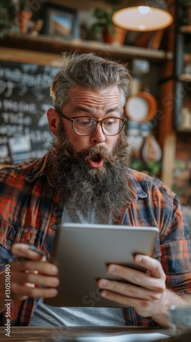 An image with a surprised man in glasses holding a tablet would be suitable for articles about technology and digital services, as well as for blogs about current trends.