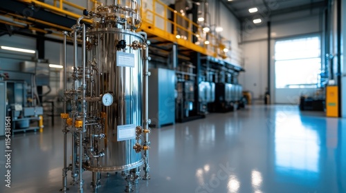 An impressive, steampunk-inspired stainless steel pressure vessel stands in a large industrial setting, signifying robustness, engineering prowess, and innovation in materials.
