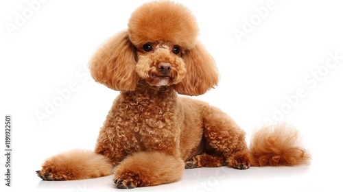 An incredibly cute toy poodle sitting gracefully on a pristine white background, exuding charm and cuteness. A captivating sight of a tiny and endearing pet.