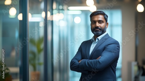 An Indian businessman stands in a sleek IT office, exuding confidence with arms crossed. The modern workspace features glass walls and ambient lighting